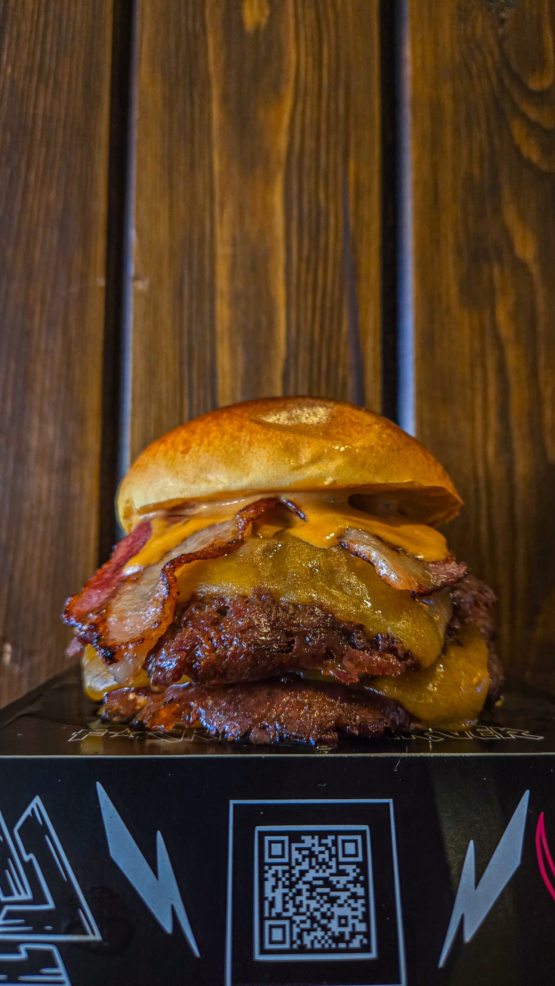 PAN BRIOCHE DE PATATA, 2X90 GR DE CARNE SMASHEADA, X2 QUESO CHEDDAR, RODAJA DE CEBOLLA DULCE DORADA A LA PLANCHA, X2 BACON CARAMELIZADO Y SALSA TASTY CASERA